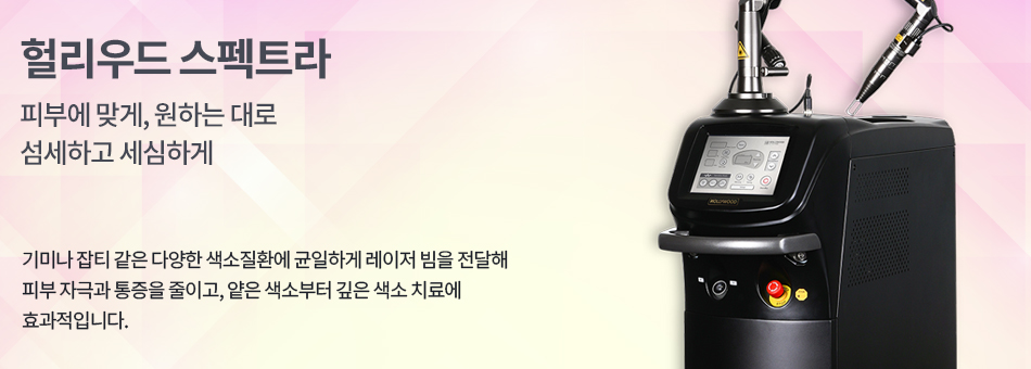 Çæ¸®¿ìµå ½ºÆåÆ®¶ó(Hollywood Spectra)´Â ¿£µð¾ß±×(Nd:YAG) ·¹ÀÌÀú Àåºñ·Î, ±â¹Ì, ÀâÆ¼ °°Àº »ö¼Ò ÁúȯºÎÅÍ ¸ð°ø, ź·Â, ÈäÅÍ °³¼±±îÁö ´Ù¾çÇÑ ÇǺΠ°í¹ÎÀ» ÇØ°áÇÏ´Â ÇǺΰú ½Ã¼úÀÔ´Ï´Ù. ƯÈ÷ ºö Ä÷¸®Æ¼°¡ ¿ì¼öÇÏ°í ¿¡³ÊÁö Á¶»ç ¹æ½Ä(PTP ±â¼ú µî)ÀÌ Á¤±³ÇÏ¿© Ç¥ÇÇ ¼Õ»óÀ» ÁÙÀÌ¸é¼ ÁøÇÇÃþ±îÁö ¿¡³ÊÁö¸¦ Àü´Þ, ¾ÈÀüÇϰí È¿°úÀûÀ¸·Î ÇÇºÎ Åæ °³¼±°ú ¸®¸ðµ¨¸µÀ» À¯µµÇÏ´Â °ÍÀÌ Æ¯Â¡À̸ç, ¹Î°¨¼º ÇǺεµ ºñ±³Àû ºÎ´ã ¾øÀÌ ¹ÞÀ» ¼ö ÀÖ½À´Ï´Ù.